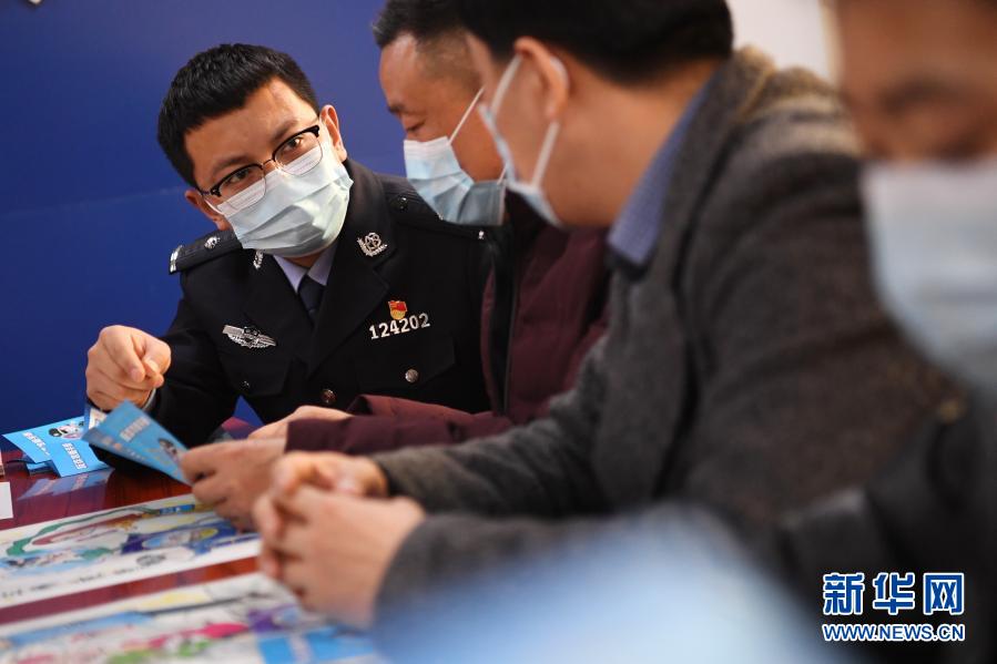 2月8日,兰州铁路公安处乘警支队民警高应亮(左一)向受害人宣传防电信诈骗等安全知识。新华社记者 陈斌 摄