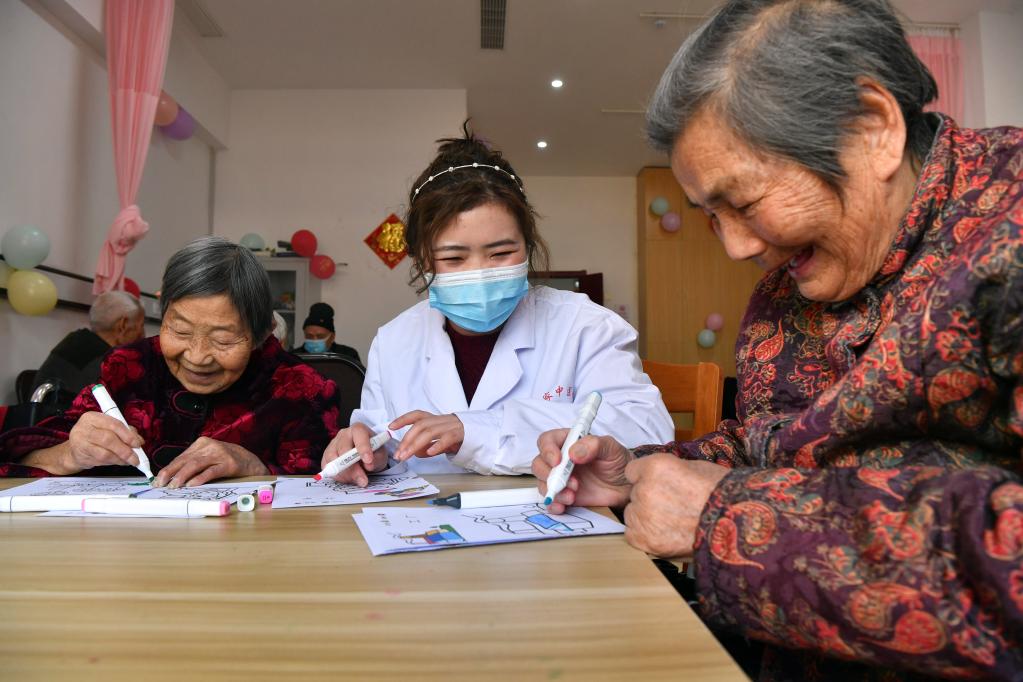 2021年2月8日,在郑州爱睦家护理院,医护人员指导老人涂色卡。新华社记者 李嘉南 摄