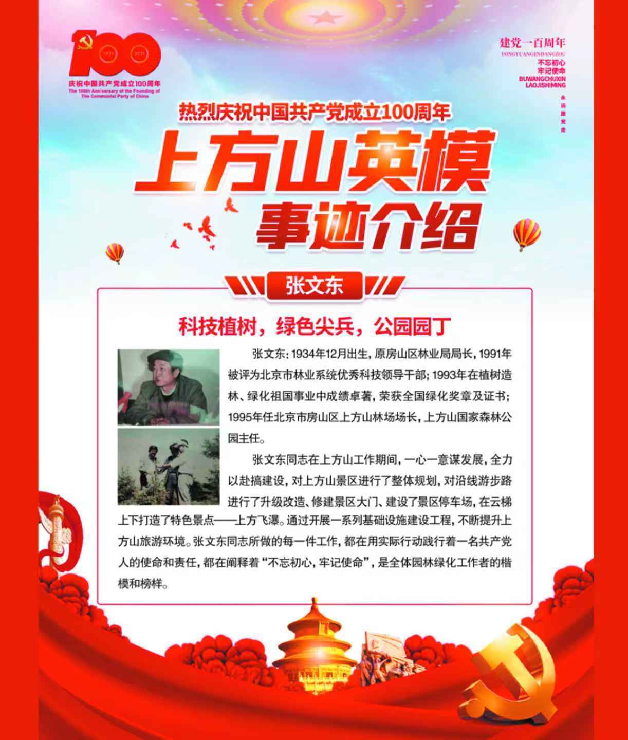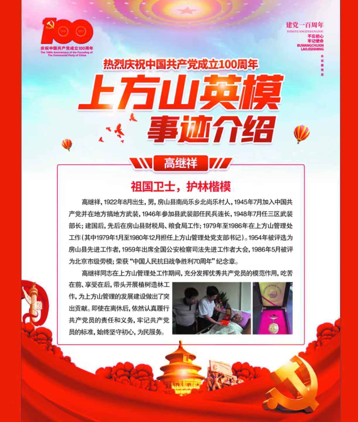 今,笔者又一次到访《英雄林广场》。上方山国有林场是新中国成立后,房山行政区域内第一个国有林场,成立于1958年。上方山自汉代有记载以来山奇林丰,文化底蕴深厚,九洞十二峰七十二禅院享誉古今,近20万株各类古树资源诠释了自然生态的原真性,是华北地区屈指可数的原始林和次生林共生区域。自金、明、清、民国到新中国成立,政府不断加强对林木和文物资源的管理,金代崇庆元年天开寺奉先县禁山榜示碑、清代同治六年顺天府谕禁告示碑、民国十九年护持山林碑以及新中国各级主管部门的有效管理,对林木资源的保护起到了决定性作用。在上千年的传承过程中,曾出现过可歌可泣的护林故事和真实事件,僧人护山创立了奇云大悲拳,传承至今;同治年间顺天府谕禁告示碑明确概括了古代封建社会当地政府对森林文物的强化管理措施;抗日战争年代,爱国僧人为保护山林和文物,无偿捐赠铜钟用以生产武器支援抗日,无名英雄玉章(法号)以禅院为基地为人民解放斗争献出宝贵生命;新中国成立后,北京市公安局公安造林大队扎根上方山周边山中,以山为家、以林为伴,艰苦创业,护山造林十二载,造林近万亩;解放前入党的老革命高继祥,扎根上方山,默默守山护林,营林造林20余年,被评为市级劳模,出席了全国公安检察司法先进工作者大会,获得了中国人民抗日战争胜利70周年纪念章;改革开放后,房山区林业局原局长张文东,主动扎根上方山开山铺路搞建设,为新时期生态建设和生态为民做出了突出贡献,获得了全国绿化奖章…。这都是《英雄山林广场》的底色。