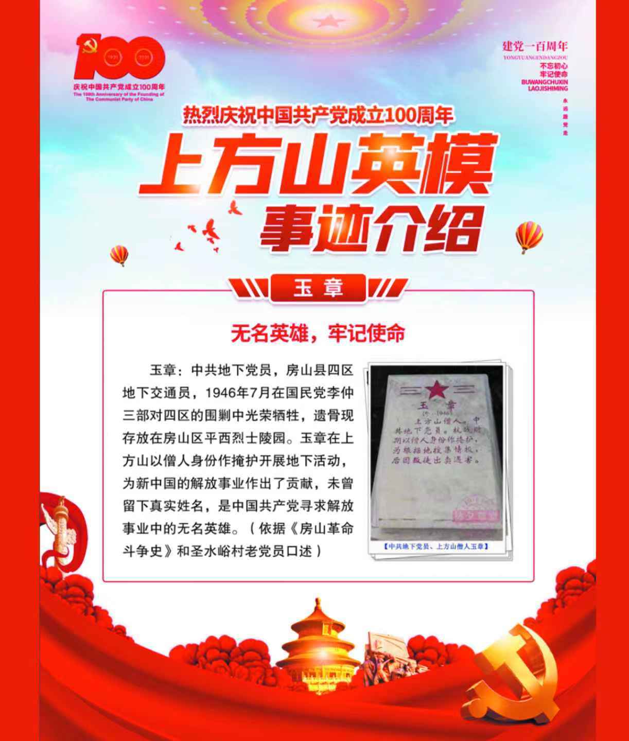 玉章,是这个《英雄林广场》英模群谱系列的抗日先锋人物之一。他无名无姓无影无形无籍无贯,以无私无畏无惧无怨无悔无欲的精神,在艰苦、复杂,事关生死存亡的环境条件下,披袈裟,居庙宇,任交通,积极为党工作,提供与传递信息信号,俺护与护送伤员,接纳与转送地下工作者,筹集药品与特需物资,应对挑战置生死而不顾,在一柱香的掩饰下默默的为抗日战争的胜利,为人民大众的翻身解放拼搏着、奋斗着,冒死舍生的工作着联络着…...