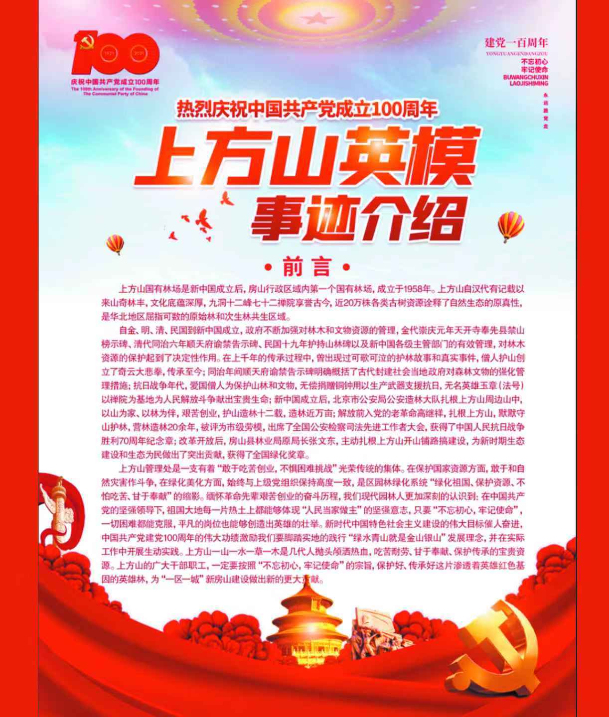 笔者多次到访此地,经过多次考查认证,并与上方山共识同论,为弘扬抗战精神,弘扬爱国精神,弘扬爱业敬业精神,申请获批,建立在上方山森林公园中央的高坡上。于庆建党百年的2021年6月26日《英雄林广场》礼成。当时笔者与房山区政协原主席唐淑荣,林业局李局长等参加揭幕仪式,笔者还随即应邀向蓝天救援队的二百多名队员进行党课教育。自哪以来的五年间,《英雄林广埸》已有上万人次观展,有上百个单位到此进行爱国主义教育及党课主题教育,引起了强烈反响。