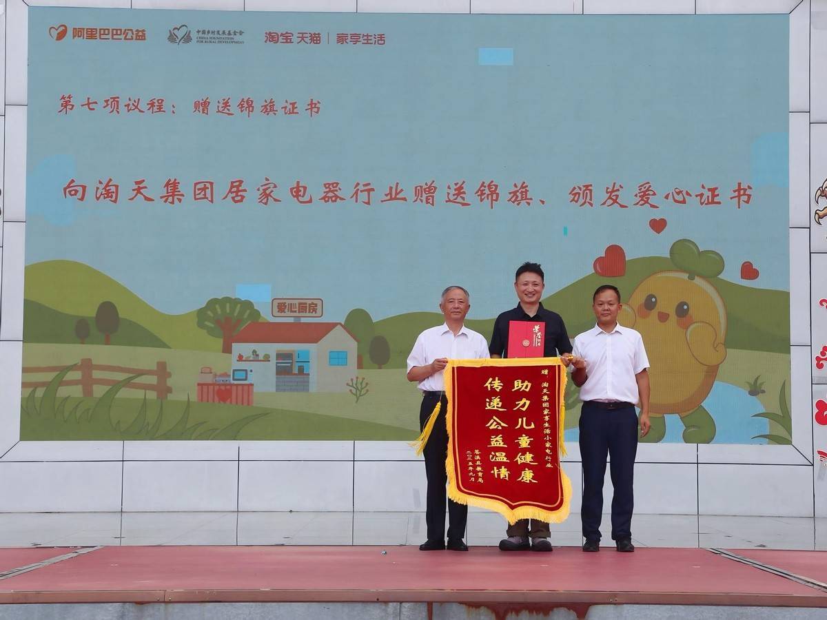 图:中国乡村发展基金会副理事长陈志刚、苍溪县教育局副局长奉小龙向天猫家享行业代表大掷颁发锦旗和爱心证书