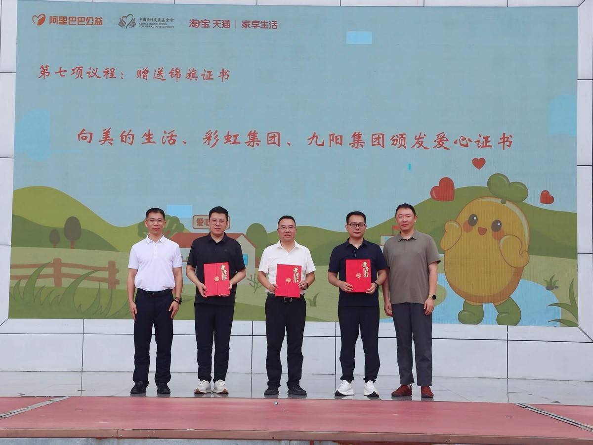 图:中共苍溪县委常委、副县长徐锋,淘天集团家享生活小家电行业总经理萧也向爱心商家美的、彩虹、九阳颁发爱心证书