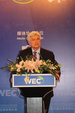 各位来宾,世界环保大会是交流思想,启发智慧,共享成果的平台,坦诚的交流可以促进相互的启迪,引发新的灵感,深入探讨可以凝聚我们的共识,我们共同的能力可以形成凝聚我们的力量,使我们齐聚一趟来怀着促进城市发展的理念,绿色经济的理念,生态文明的理念,使我们国内外的来宾来贡献指挥,献计献策,我相信,我们的能力一定会形成一个动力,我们世界环保大会一定能成为推动生态低碳发展,绿色发展的一个重要的平台和一个新生的力量。
