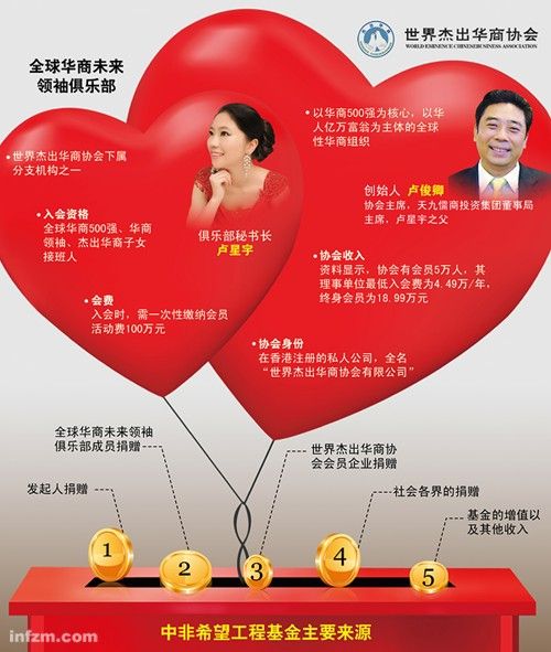 这正是世华会的初衷。尽管卢俊卿一直对外宣称中非希望工程是一项百分之百的善事,但世华会官网却不是这样介绍的??“慈善开路,商务跟进,为会员企业开拓非洲市场提供品牌支持与合作捷径”。