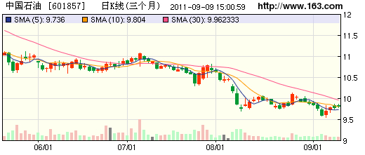 9月5日,大盘暴跌50点。中石油同样无法独善其身,截至收盘,中石油全天下跌1.74%,报收9.60元。6日,中石油更是开盘后再度下挫,直接打破前日9.60元的收盘价,盘中创出了9.55元的又一历史新低。创出了自2008年10月28日(盘中最低9.71元)以来股价历史新低。