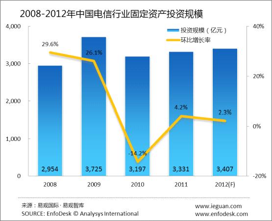 根据EnfoDesk易观智库研究表明,从2008年至2011年的4年间电信业固定资产投入进入相对稳定的高投入期,共计13206.6亿元,大致相当于2000年至2007年8年的投入额总和。
