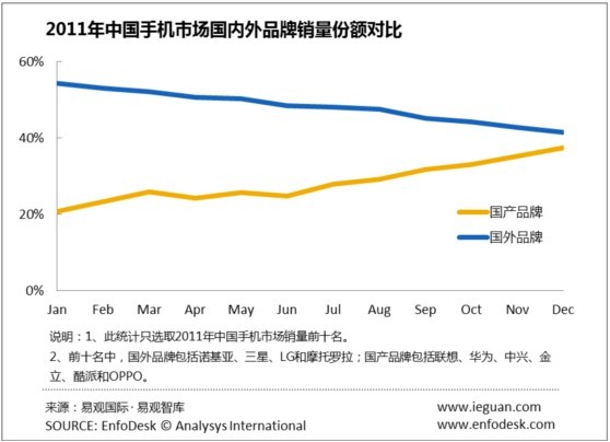 据EnfoDesk易观智库长期对中国手机市场销量监测数据显示,纵观2011年全年手机市场,销量前十品牌中国产品牌占据六席。截止2011年底,国产品牌整体市场份额是37.5%,同时四大国际品牌市场份额整体是41.5%,国产品牌正在逐步赶超国际品牌市场份额。