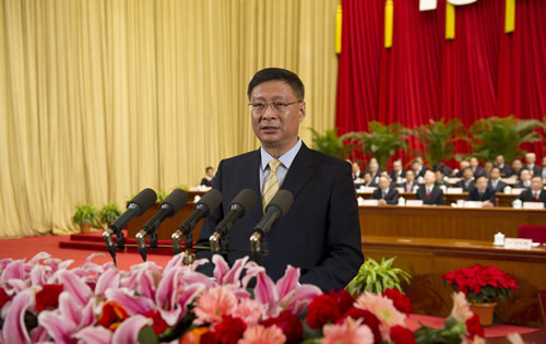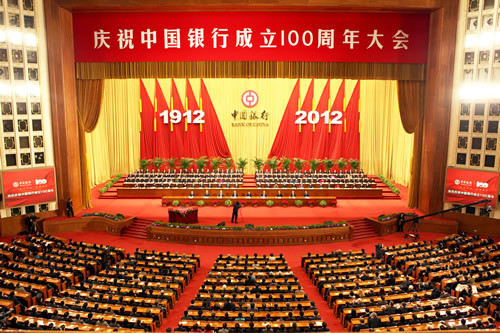 人民大会堂鲜花绽放,处处洋溢着喜庆热烈的气氛。主席台正上方悬挂着中国银行行徽,1912和2012的字样分列两侧,标示着中国银行走过百年风雨历程。会场二层眺台悬挂着大幅红色标语:“在党中央、国务院坚强领导下,深入贯彻落实科学发展观,团结奋斗,开拓创新,加快建设国际一流银行,共同创造更加美好的明天!”