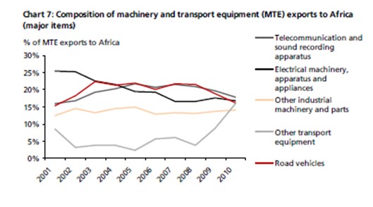 对发展中市场出口的机械和器材在2010年占制造类产品出口的超过30%。在墨西哥,多达54%的制造类产品出口为机械和器材。尽管如此,中国向这些市场出口的具体机械和器材值得探讨。从一个趋势的角度来看,家电类机械的出口在两个市场中的占比已经下降,而其他交通类器材(除车辆外)的占比在非洲近年来快速增长。在两个市场中,电讯和录音器材在机械和器材出口当中的占比最大。打个比方,从事视频会议、移动通讯系统和数据通信器材开发的上市公司中兴通讯,在2007至2011年财年间的三分之一收入来自非洲。
