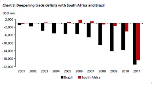 中国与巴西和南美洲存在相当大的贸易逆差。事实上,与巴西的贸易逆差在过去10年里逐年加深,而与南美洲的逆差更是自2008年提高三倍。对巴西的进出口在2001年至2011年期间平均以相等的速度增长,从巴西进口的增长主要为基础商品和宝石。