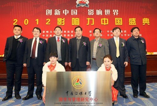 在2012影响力中国盛典上,进行了中国传媒大学国学与管理研究中心揭牌仪式。第十届全国政协副主席李蒙,原《经济日报》总编辑、中国企业联合会、中国企业家协会执行副会长冯并,中国传媒大学副校长吕志胜,中国企业联合会、中国企业家协会执行副理事长刘鹏,中国传媒大学MBA学院院长张树庭,国资委《市场观察》杂志社总编辑刘彤,中国传媒大学MBA学院副院长王雪野出席揭牌仪式。