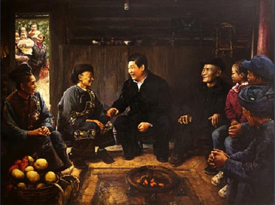 《温暖》这幅油画,取材于2013年深秋(11月3日),习近平到我国14个集中连片特困地区之一的武陵山区湘西土家族苗族自治州考察时,在土家族聚居的花垣县十八洞村特困老人施齐文家的情景。油画作者对此次考察的电视画面和摄影图片资料进行了细致研究,选取总书记与施齐文老夫妇亲切交谈的场景为主体,同时在创作中打破写实的限制,按自己的理解选取画面,截取总书记在得知老夫妇都不识字,家里又没有电视,所以老伴石爬专问他:“怎么称呼您?”总书记笑答“我是人民的勤务员”后,亲切地握住64岁石大妈手说“你是大姐”的这一寓意深刻的瞬间,典型化的再现了总书记对扶贫地区人民群众的深切关爱,这一场面也成为他要求各级党委更精准扶贫的真实写照。作品将西洋绘画的各种表现技法和民族绘画的长处结合起来,使之具有鲜明的民族特色和时代特征。真实还原了木屋的四壁黝黑,保留了唯一的“电器”节能灯,艺术性地将总书记考察活动中其他场景人物汇聚其中,使画面主体的人物有老有小更加丰富,屋外背景群众竞相汇聚的欣喜神情跃然呈现。特别是画作将习总书记与石大妈面前的炭盆点燃,是作品的神来之笔,用炭火映照着手拉手对望亲切交谈的领袖与百姓,使领袖关心民瘼,造福百姓的真挚感情,老人和孩子或被感染的微笑,或凝神专注听他们交谈的神情更加细腻,实在是非常自然、非常真实的客观现实再现,很动人。作者在进行严谨的写实描绘中,运用工笔重彩的传统表现手法,使人物面部与屋墙地面形成强烈对比,增加了温馨的喜庆气氛。在创作描绘中,作者又进行了大胆的艺术加工,根据画面主题和总体需要以及民族审美情趣进行创作。在绘画表现技法上,严格地按西方写实绘画中的素描要求去处理,运用一次性表现结合古典透明技法,充分体现出画面的空间色彩关系和厚重的质地表现效果。如在透视和光影的处理上,作者采用焦点法和集中光影法,突出作品形象,刻画真实生动,光色表现对比协调,整体画面统一,给观者以亲临之感。整幅作品构思巧妙,宏伟,气派非凡,温馨喜庆,完美地表现了党和人民的血脉深情。