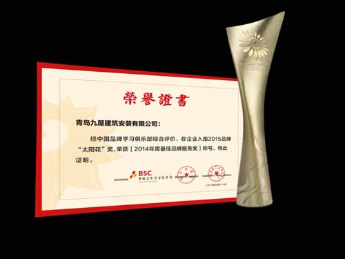 2015年3月27日,中国品牌“太阳花”奖暨年度企业、个人颁奖盛典在北京昆泰嘉华酒店隆重举行。青岛九屋建筑安装有限公司荣获2014年度最佳品牌服务奖。