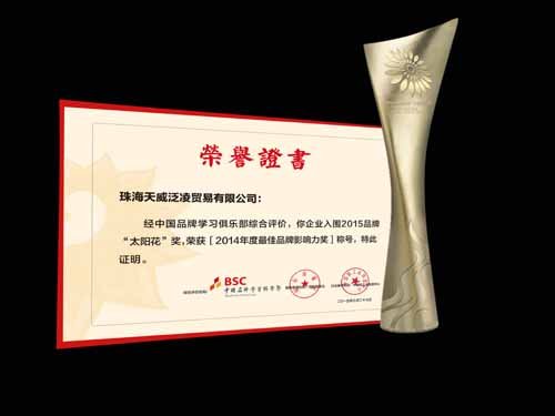 2015年3月27日,中国品牌“太阳花”奖暨年度企业、个人颁奖盛典在北京昆泰嘉华酒店隆重举行,珠海天威泛凌贸易有限公司荣获2014年度最佳品牌影响力奖。