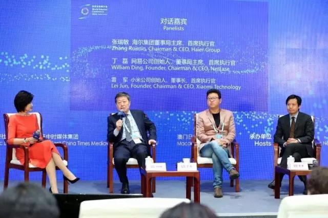 凤凰卫视当家主持人吴小莉(左一)与张瑞敏(左二)在论坛现场进行了互动访谈,共同参加论坛的还有丁磊(右二)、雷军