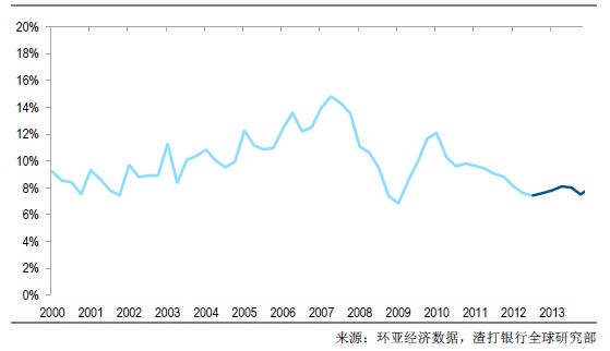 2012年总出口增长8.3%、进口5.3%。尽管总贸易增长低于政府年初设定的10%的目标,我们认为随着全球需求的温和复苏、中国2013年贸易前景会更好。我们预计2013年经常账户顺差的GDP占比将增加到3.3%、对GDP增长将做出积极贡献。(作者: 申岚)