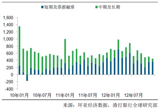 近期公布的 2012年12月份的贸易和金融数据符合我们对2012年第四季度中国经济逐步复苏的预判。虽然新增贷款低于市场预期(只有4543亿元人民币),但银行贷款占社会融资总量的比重持续下降,表明其重要性在降低。因此市场焦点已经转移到社会融资总量和其它重点非银行资金渠道,包括委托贷款、信托贷款和债券,在12月维持增势,表明境内企业和基础设施建设项目的融资环境并没有出现明显恶化。