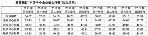 12月30日,渣打银行“中国中小企业信心指数”最新发布的结果显示,2013年第四季度,“中国中小企业信心指数”为50.37,比第三季度下跌2.76个百分点,其中分类指数的宏观信心指数、运营信心指数、投资信心指数和融资信心指数分别为57.77、42.59、50.66和31.47。