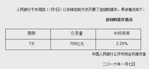 据中国人民银行网站消息,人民银行于本周四(1月7日)以利率招标方式规模为700亿元逆回购操作。此次逆回购中标利率2.25%,期限7天。(中新网金融频道)