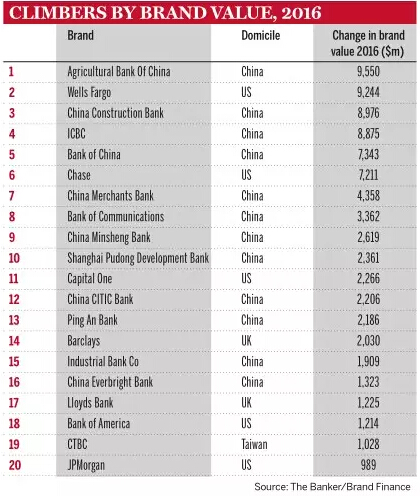 本月初,全球银行业权威杂志英国《银行家》发布了最新的《2016年全球银行品牌500强排行榜》。农业银行位列第四,排名上升四个位次,品牌价值上升幅度排名第一,增加了96亿美元。